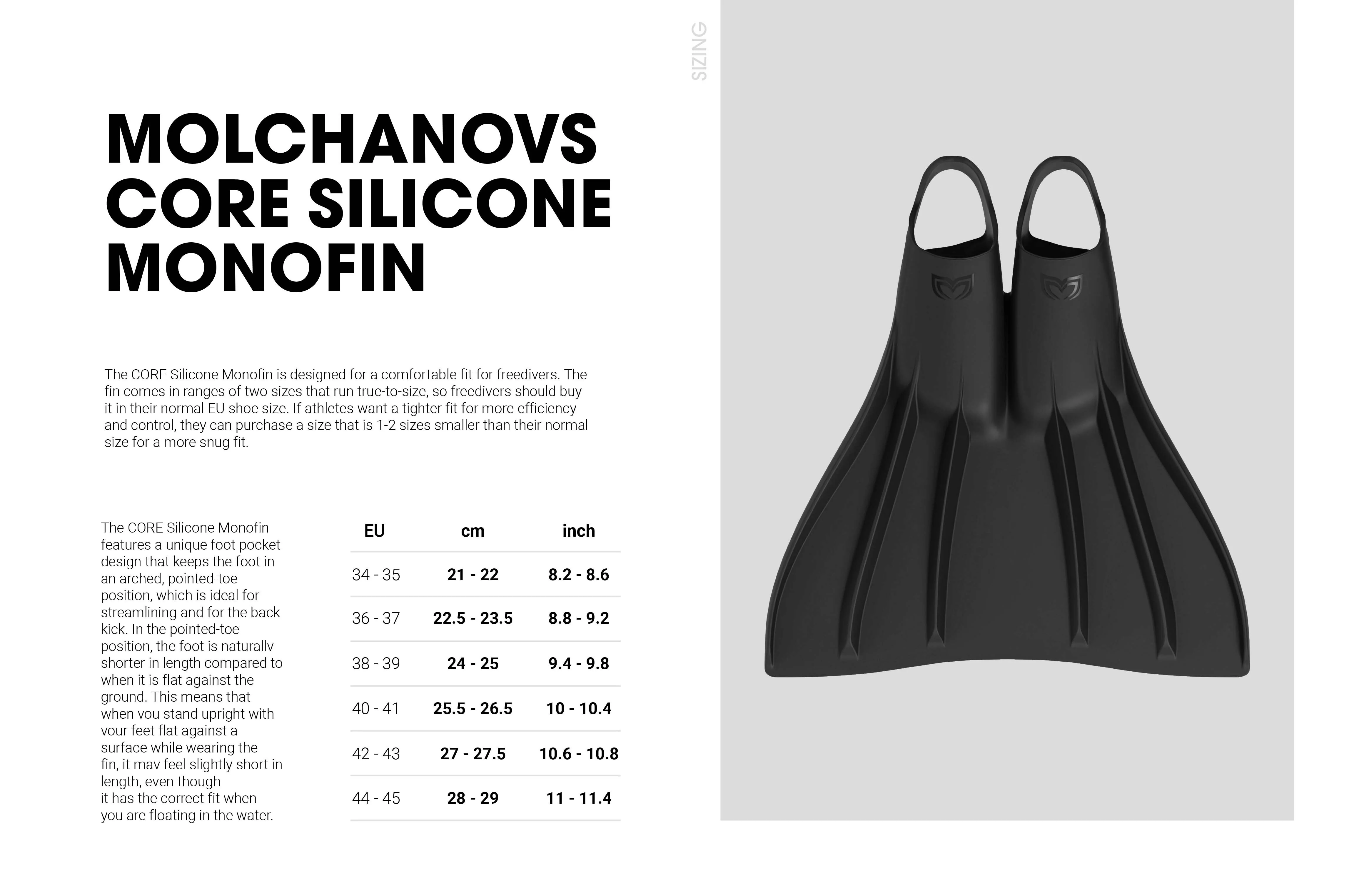 Put the pleasure back into training and fun diving with the CORE Silicone Monofin. Constructed to look as good as it feels with captivating curves and a minimalistic Molchanovs logo on the foot pockets. Ideal for all levels of freedivers who want to effectively train their monofin technique or want to experience the power of a monofin before committing to purchase premium equipment such as the PRO Monofin 4 Fiberglass or the PRO Monofin 4 Carbon. The CORE Silicone Monofin is also ideal for mermaids who require more performance, speed, and a sense of security inside of their mermaid tail.