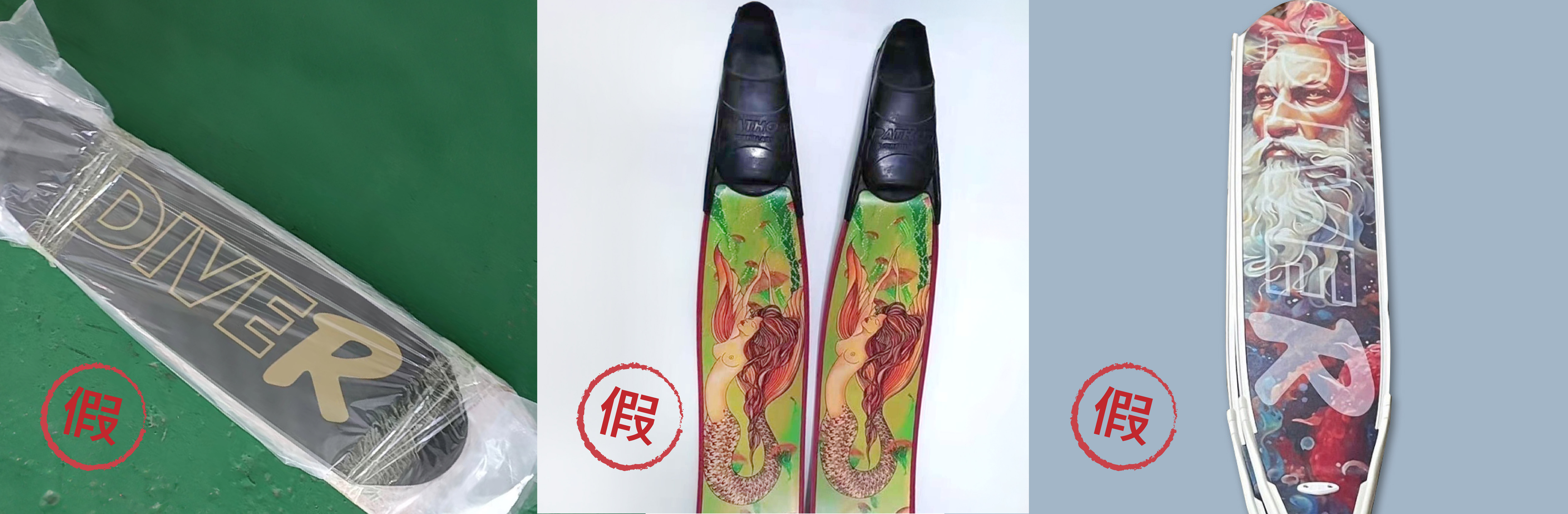 DiveR擁有多款圖面設計,使你輕易地找到自己心目中的理想之板片。每雙碳纖蛙鞋板皆由精細印刷而成,主要以金色大logo為其特色。以金色大logo象徵著水下耀眼的光芒及堅定且不被打到之潛水員精神。亦有偏光logo設計,使滿版設計不被其logo影響。