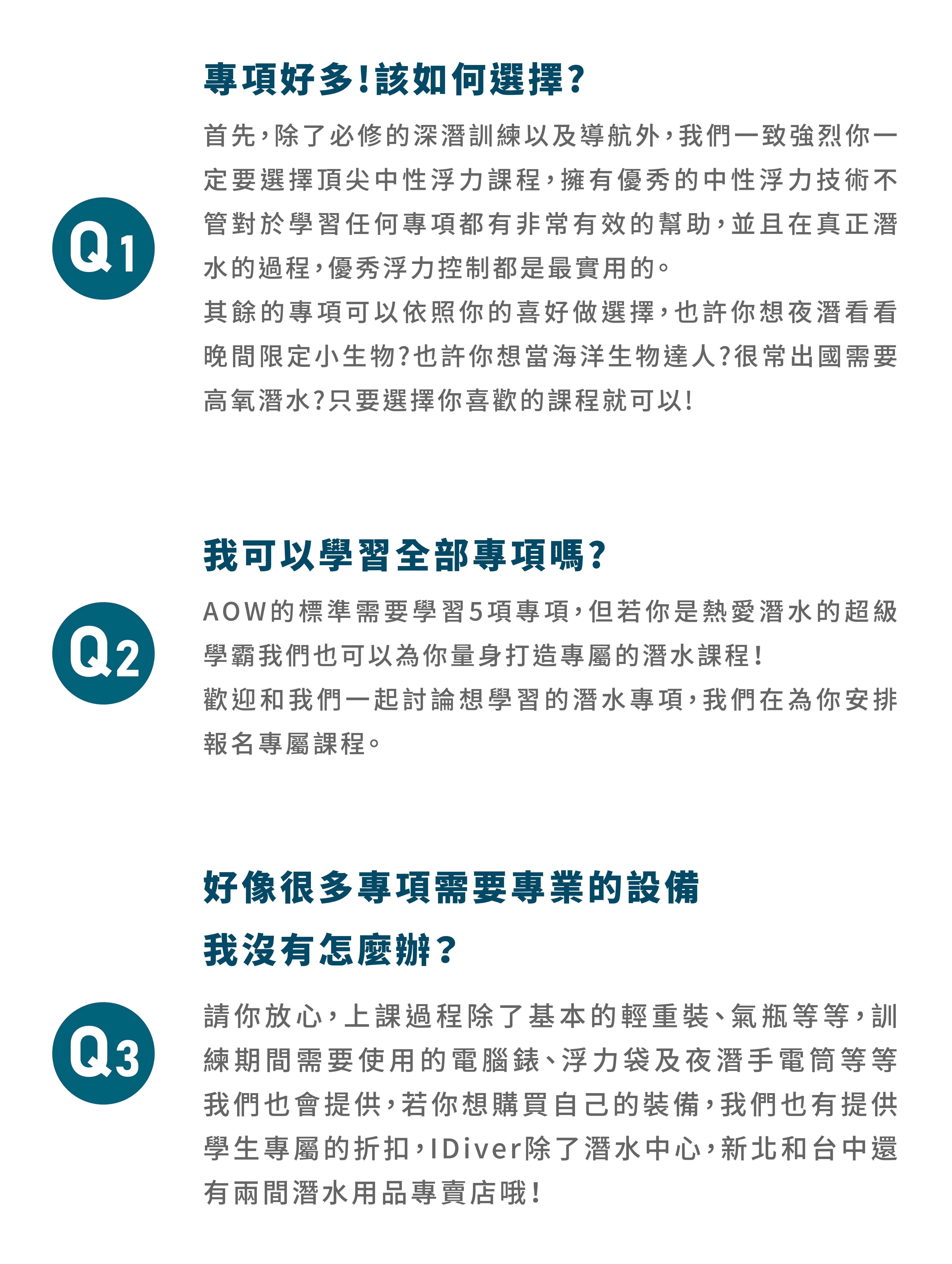 已經瘋狂地愛上大海了嗎?想要下潛到更大的深度?想掌握中性浮力,拒絕再當海底吸塵器嗎?那麼AOW絕對適合你!