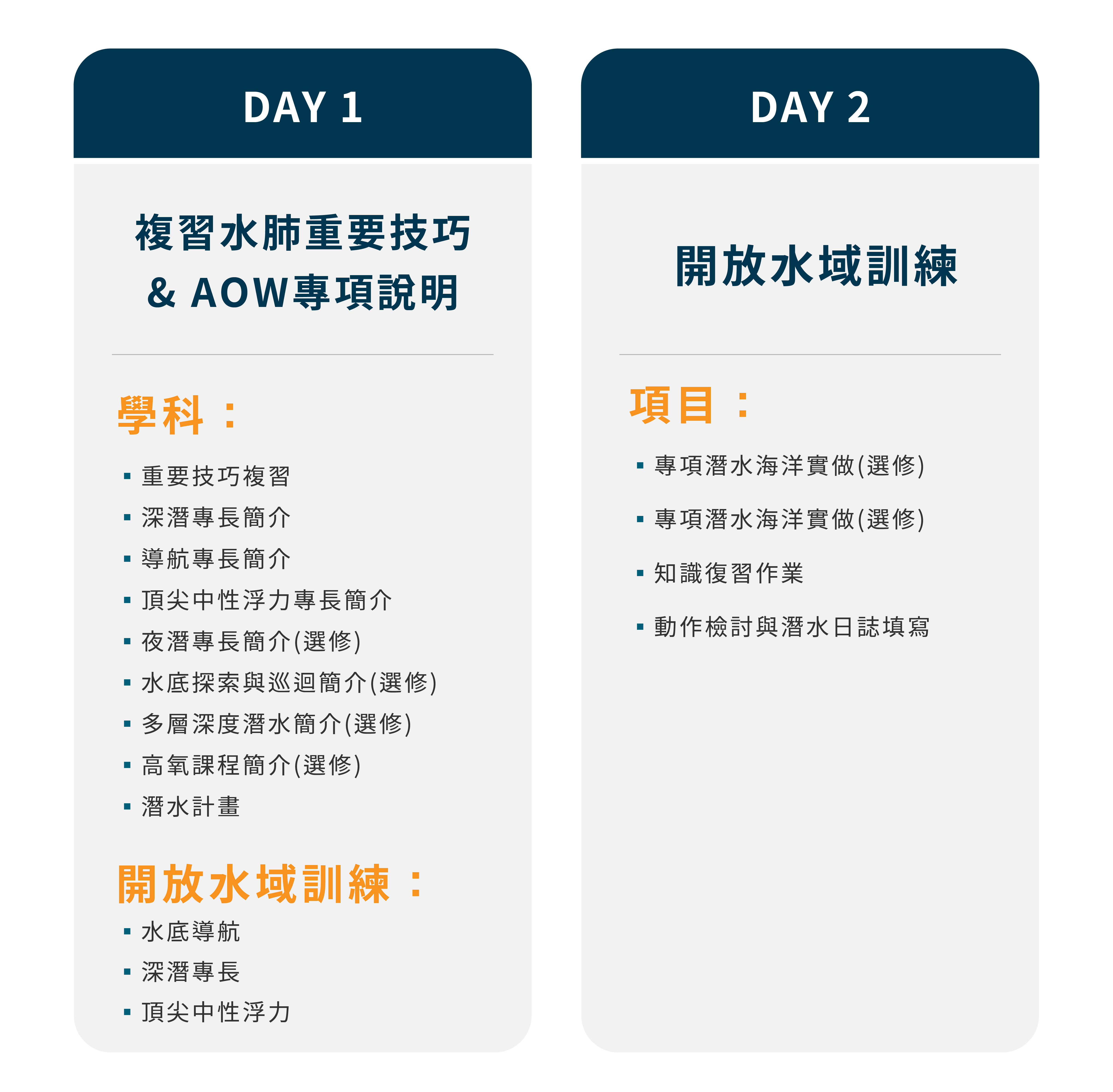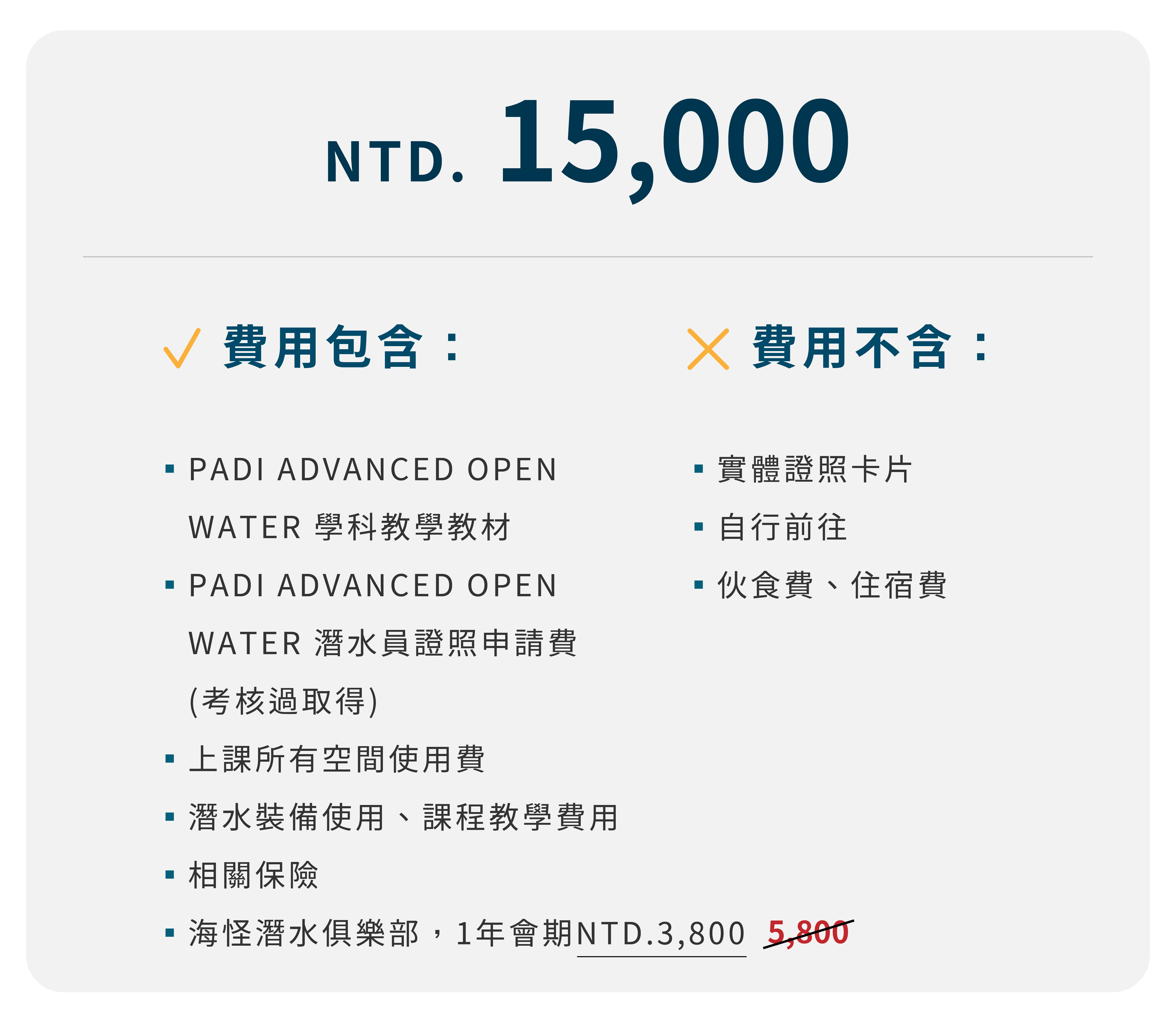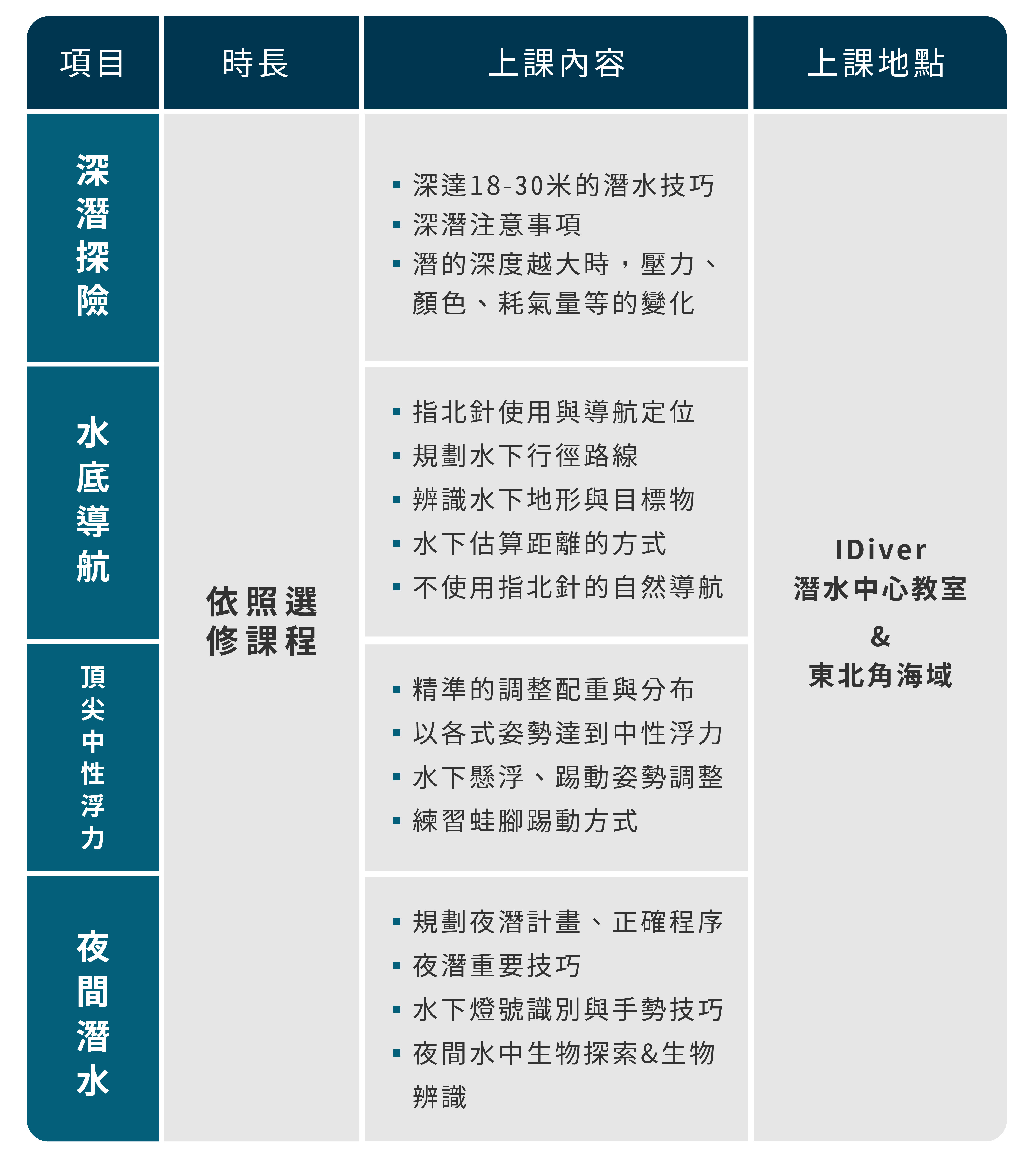 「Advanced Open water」進階開放水域潛水員課程,是OW之後更進階的潛水員證照,最大深度可以從18米提升到30米,讓你探索更多海洋的奧秘;上課分成理論和實做,總共需要2天時間。