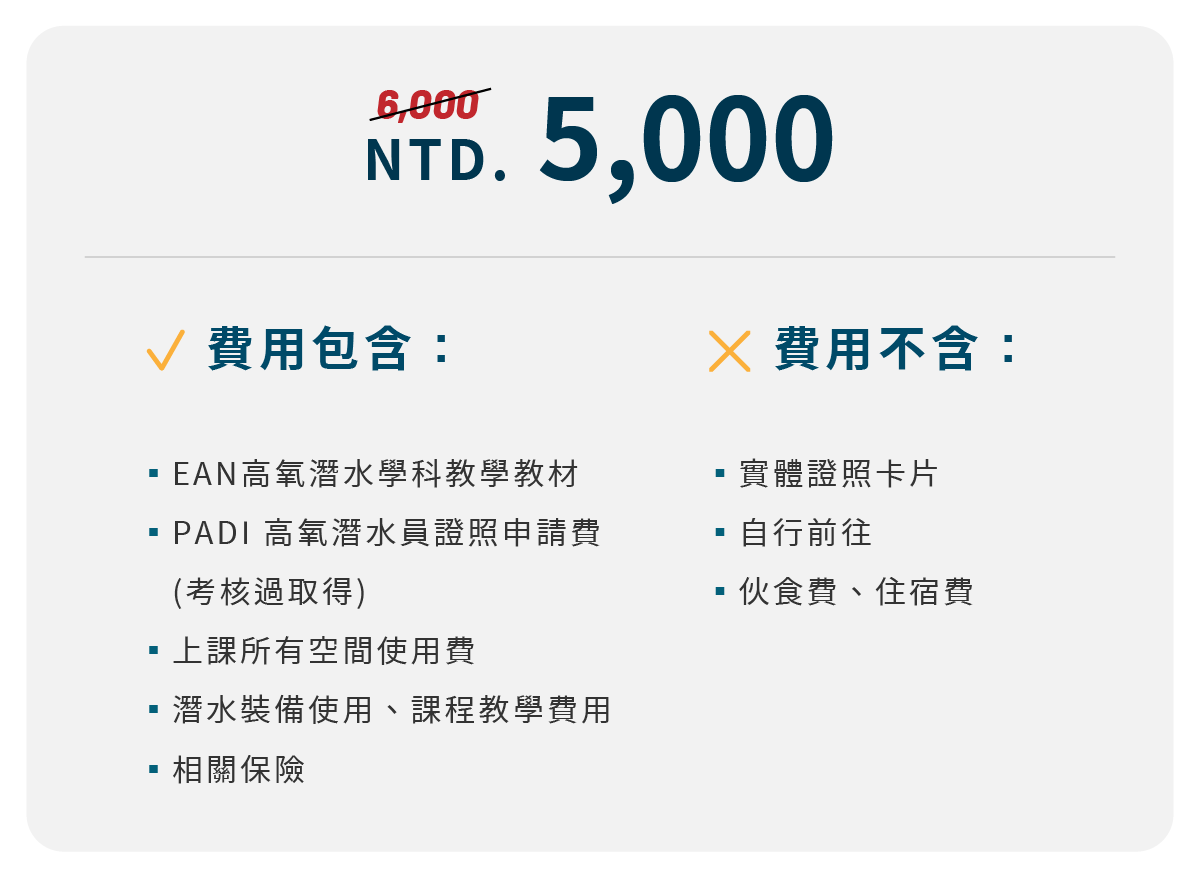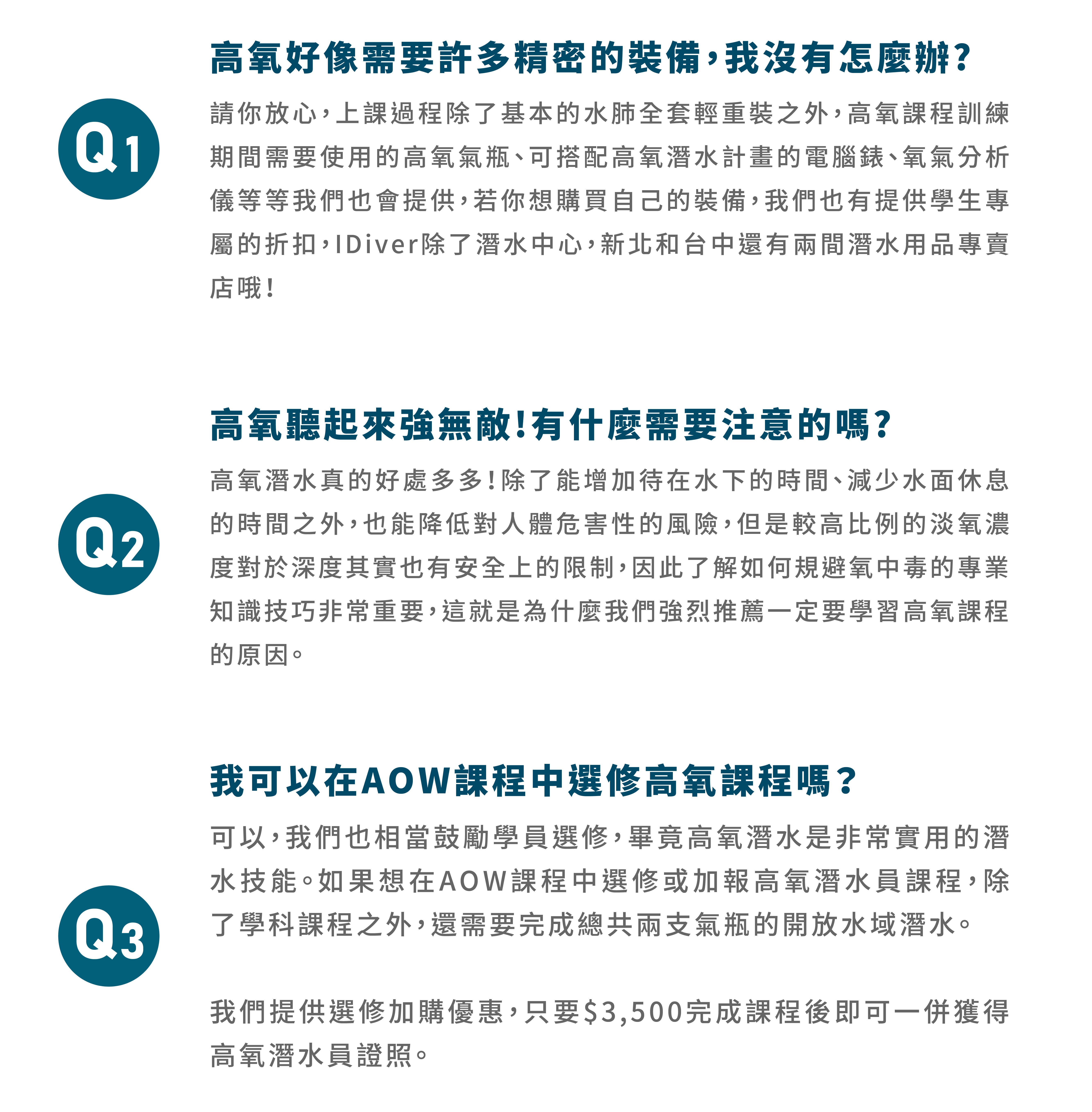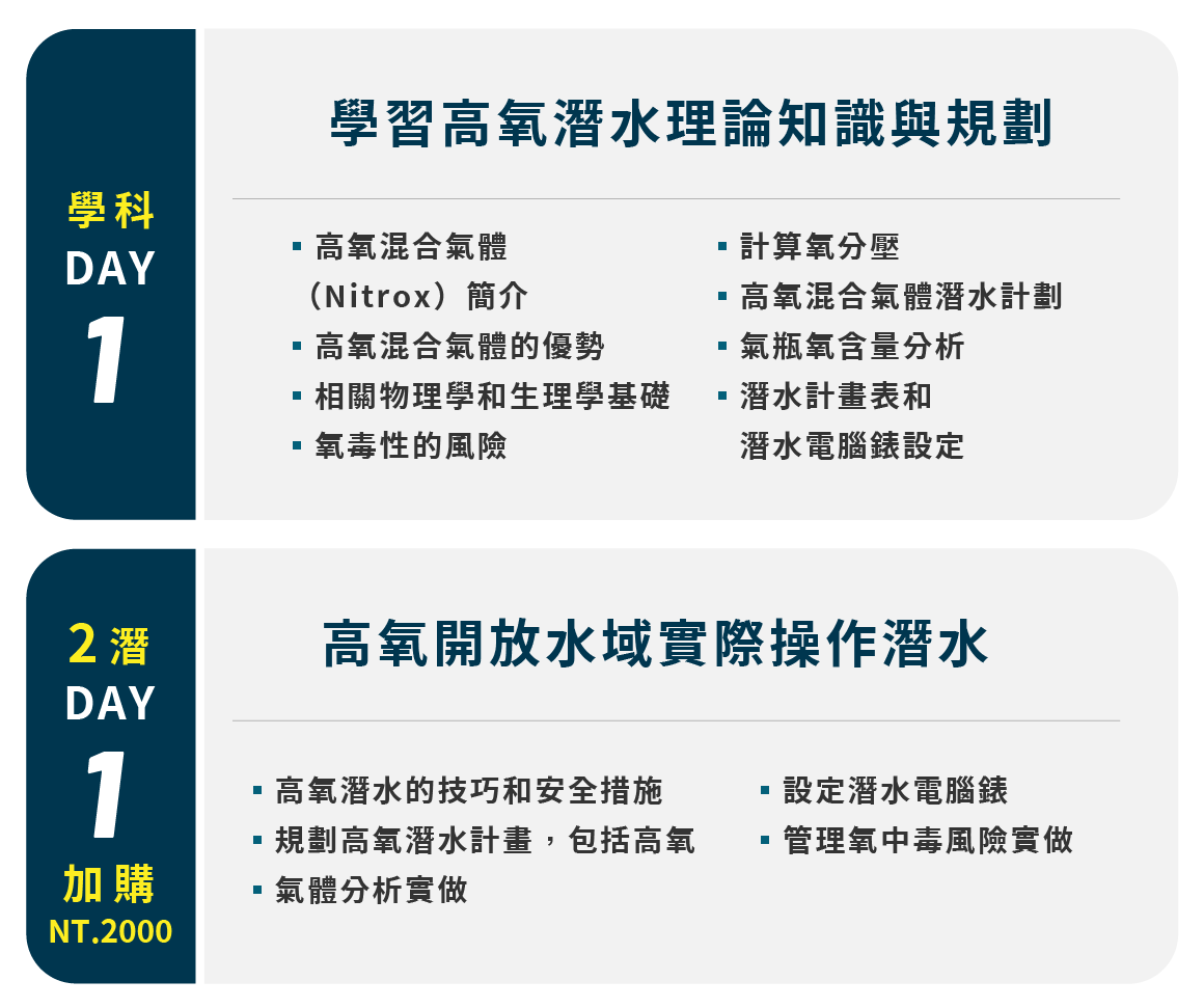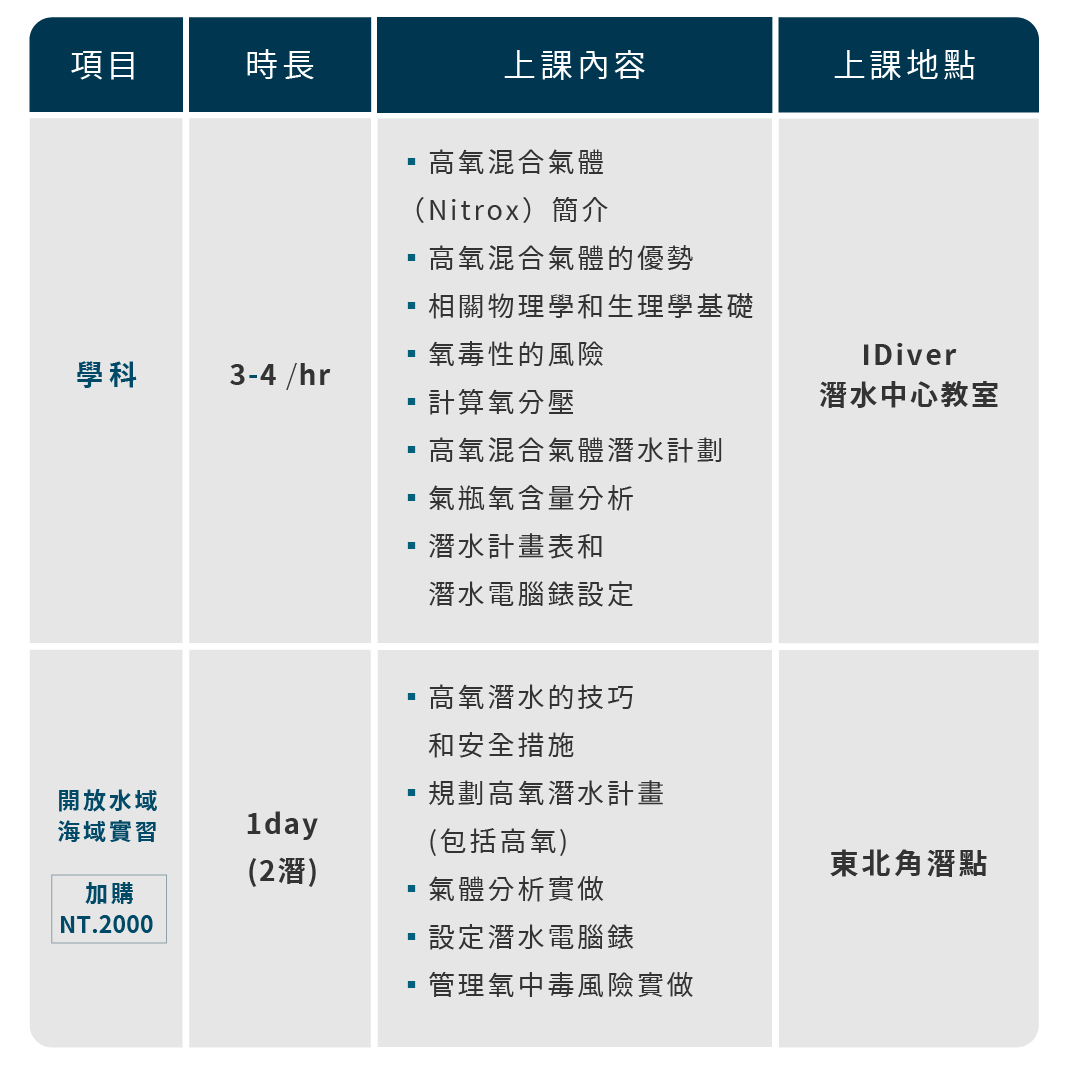 訓練你使用高氧空氣(氮氧混合氣從)從事潛水活動,能夠有更多免減壓時間,特別是在進行重複潛水的時候,水面休息時間也可以縮短,對人體的危害性也大幅降低。已成為世界各地潛水愛好者的趨勢喔!