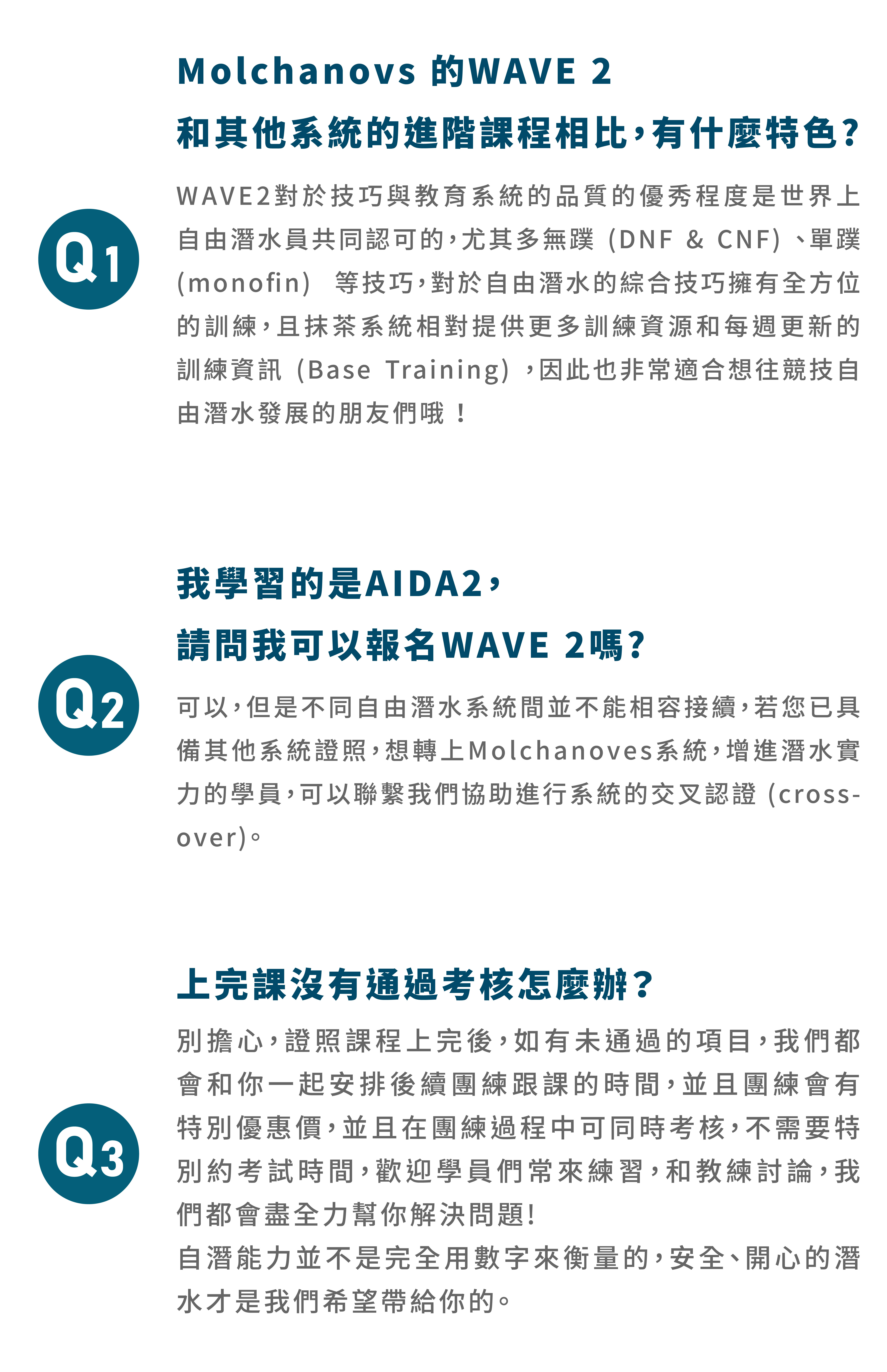 若你已經完成自由潛水的相關課程,並且非常熱愛這項運動,想更完整的體驗不同深度的大海,增進自己的自由潛水技術,以及未來對自潛比賽、無蹼、單蹼等延伸項目都有興趣,那麼 WAVE 2非常適合你。