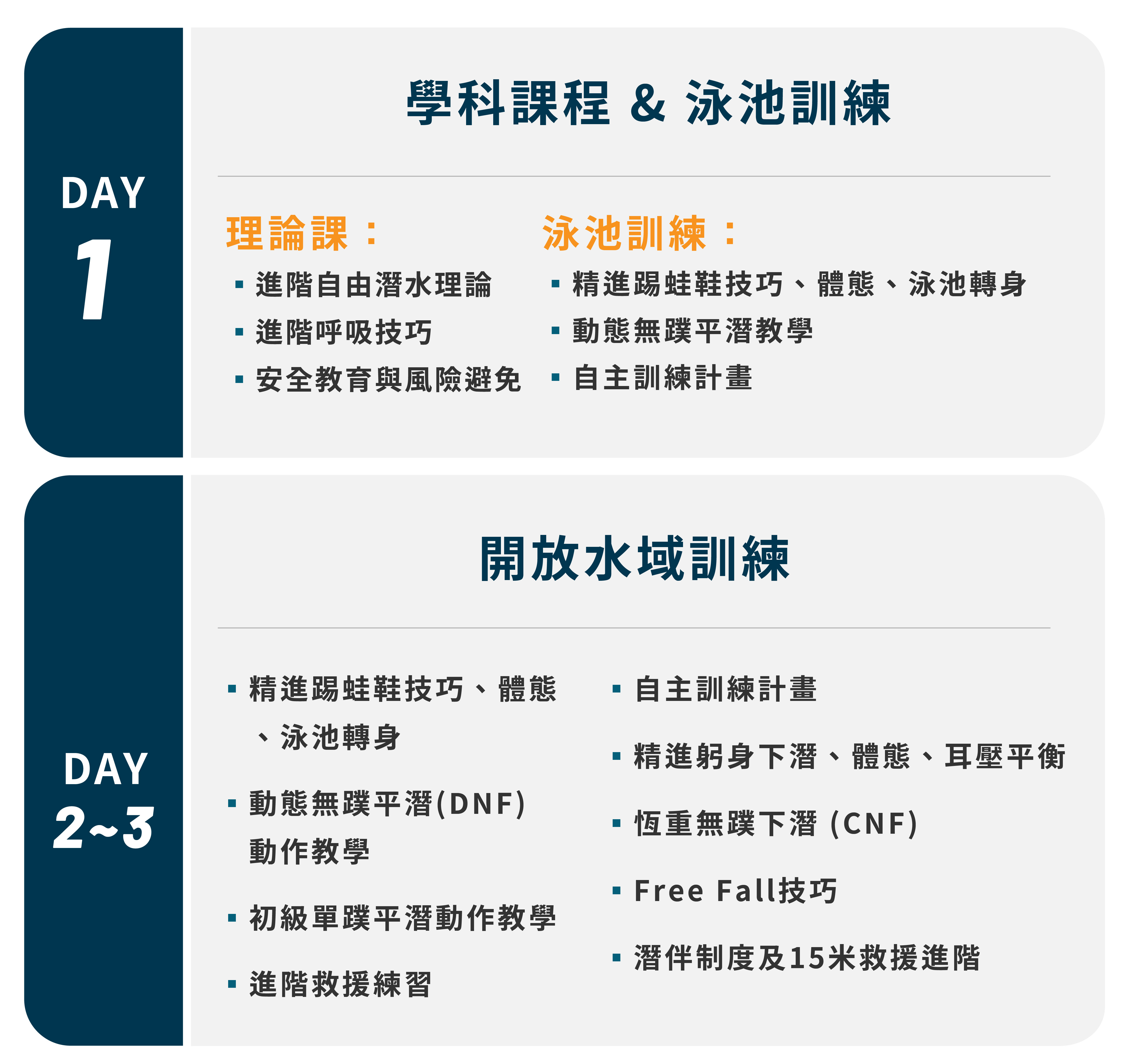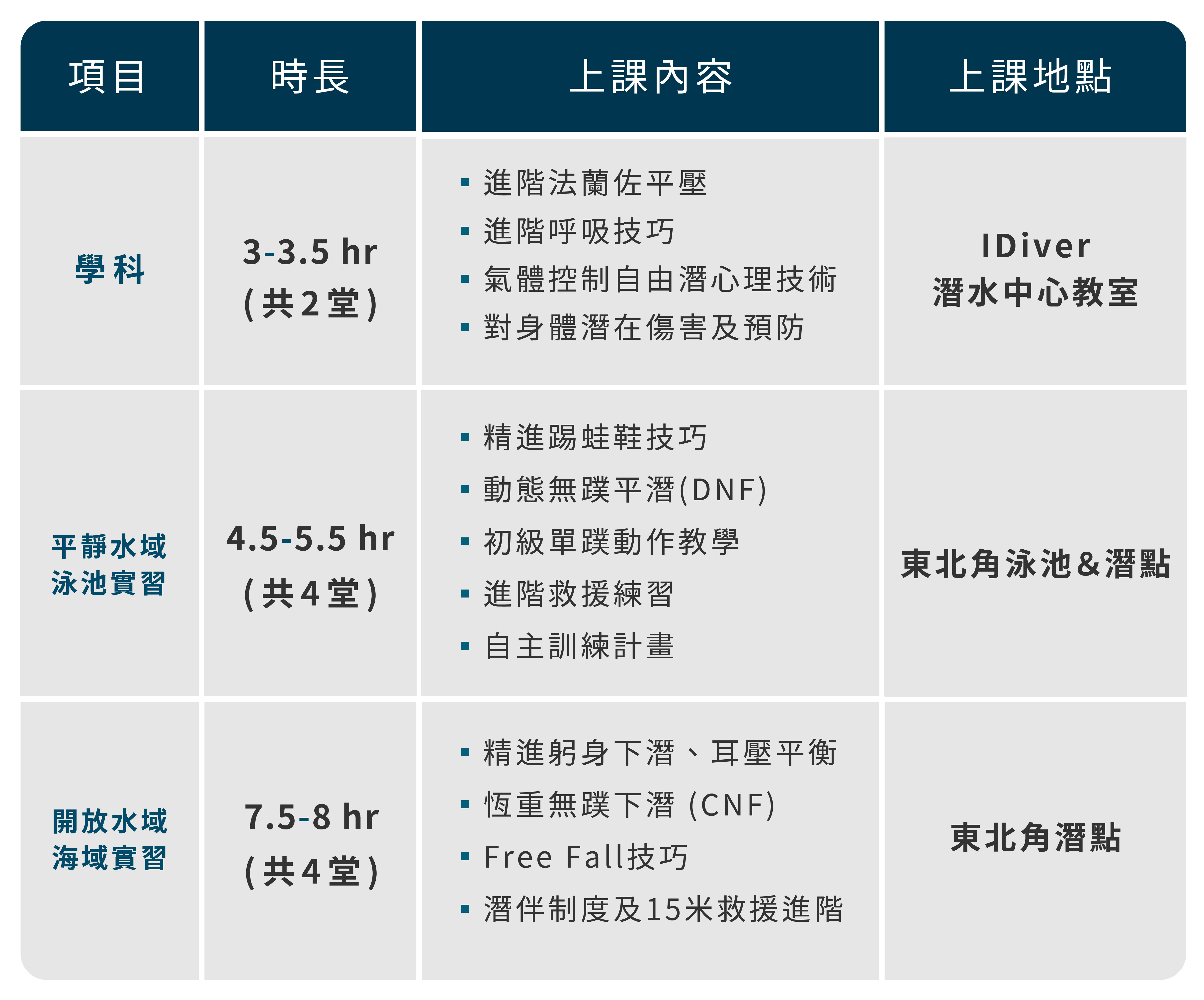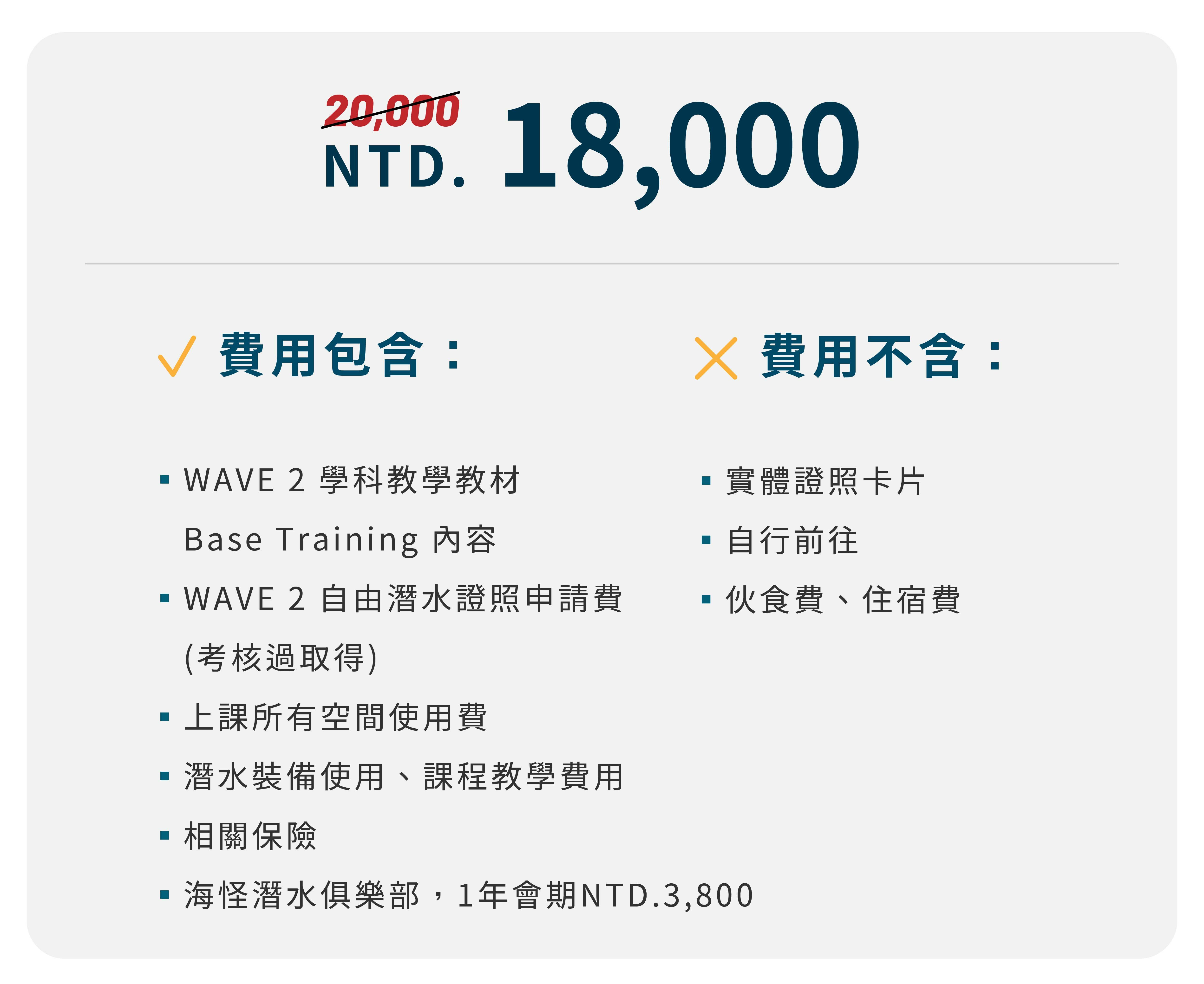 WAVE 2 為抹茶系統進階的自由潛水證照課程,本課程上課時間為4天