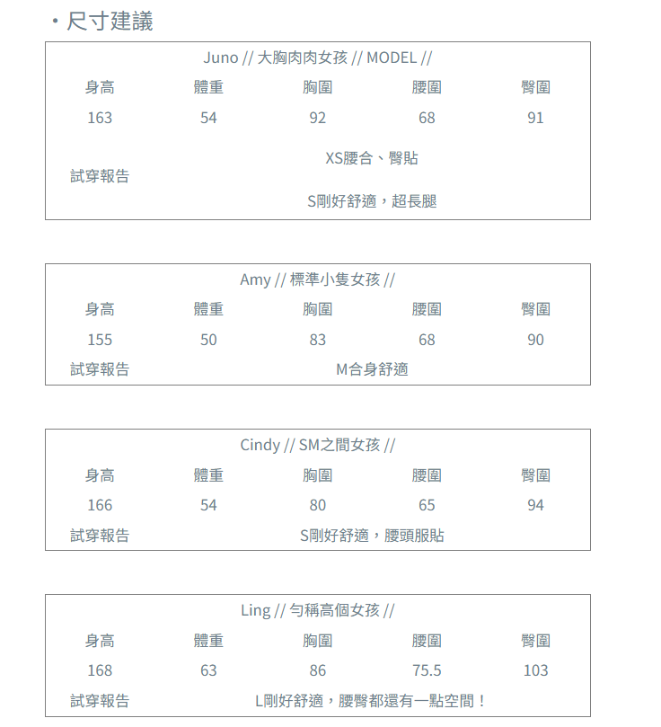 試穿員尺寸參考: