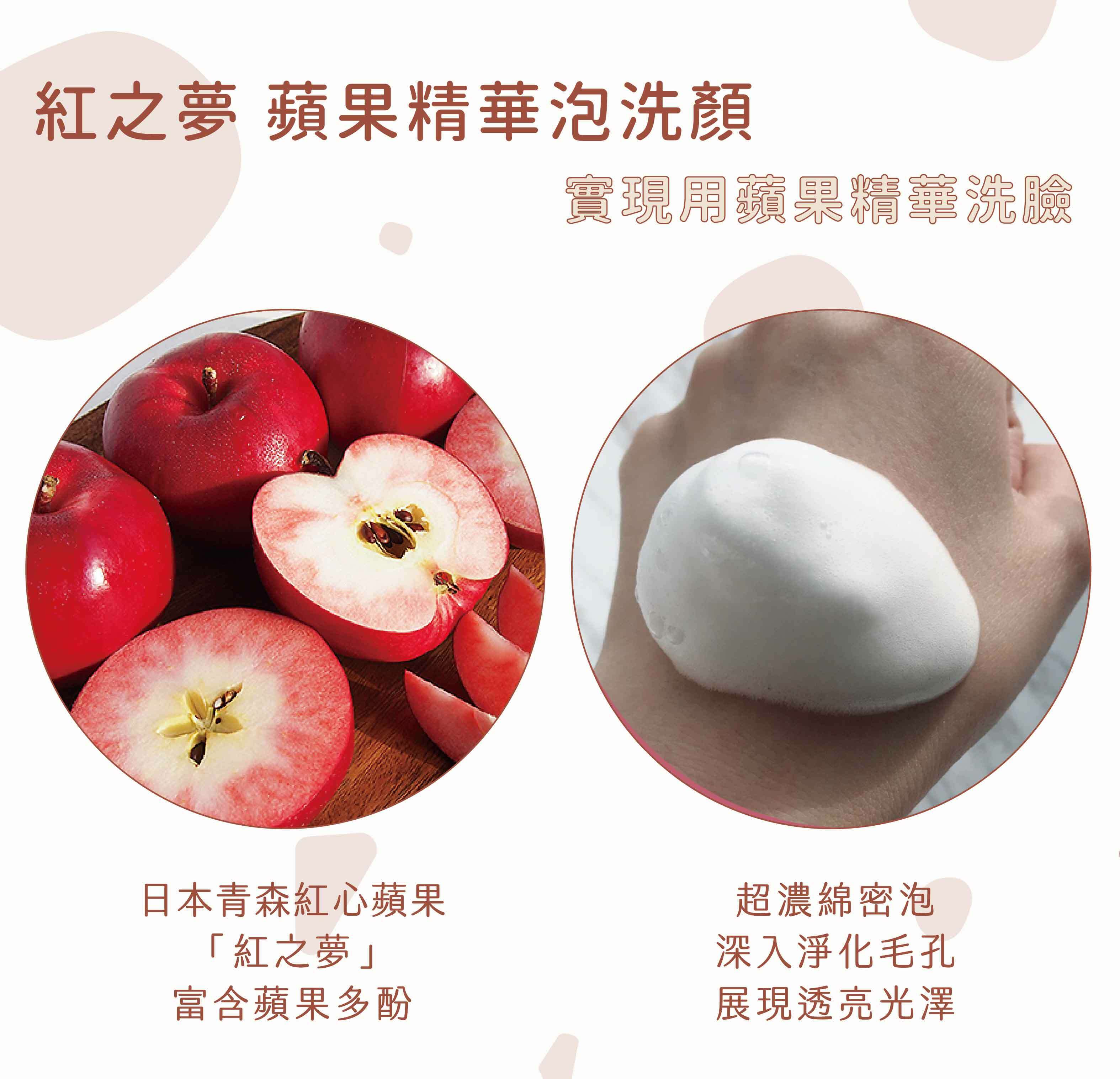 含日本青森縣特有品種「紅之夢蘋果精華」的潔顏慕斯泡泡。