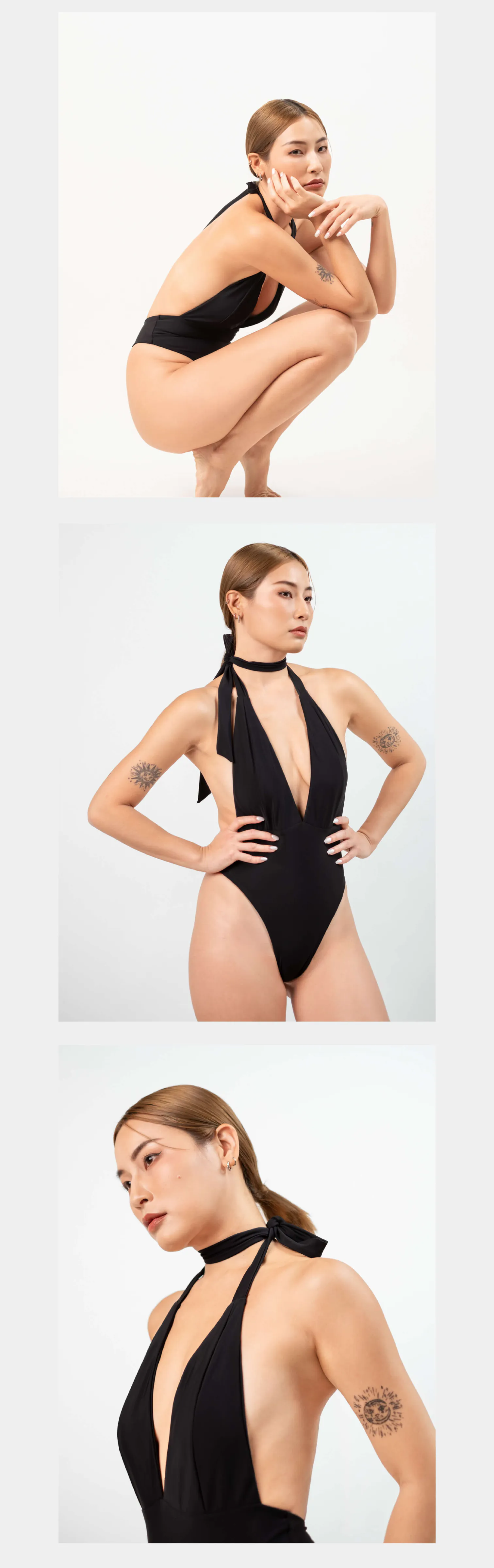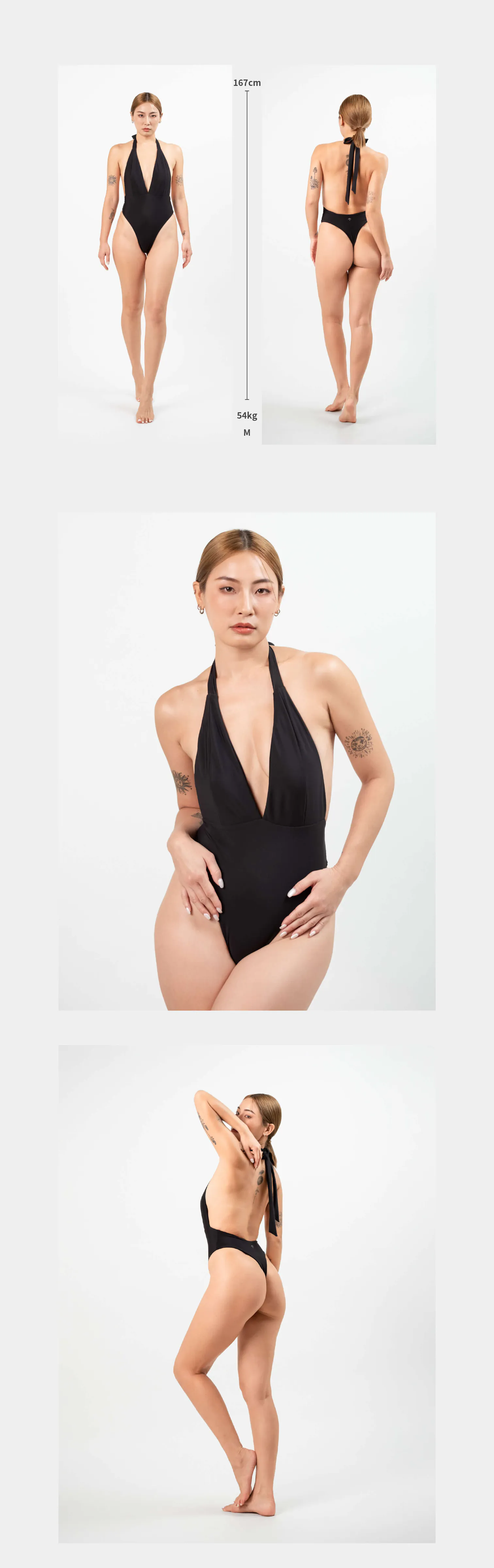 俐落剪裁與黑色相遇,用最純粹的色彩演繹最立體的個性,側胸 V 型剪裁,配上極高衩及全開美背,讓質感與性感兼具,一件泳裝就能穿出不同風格。