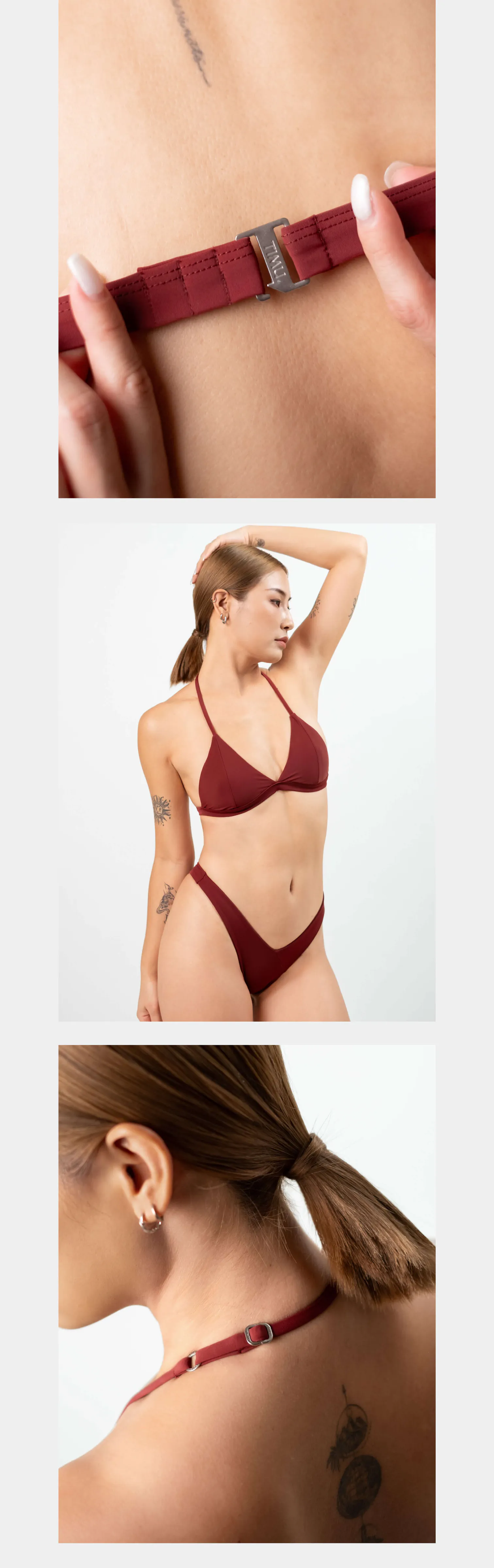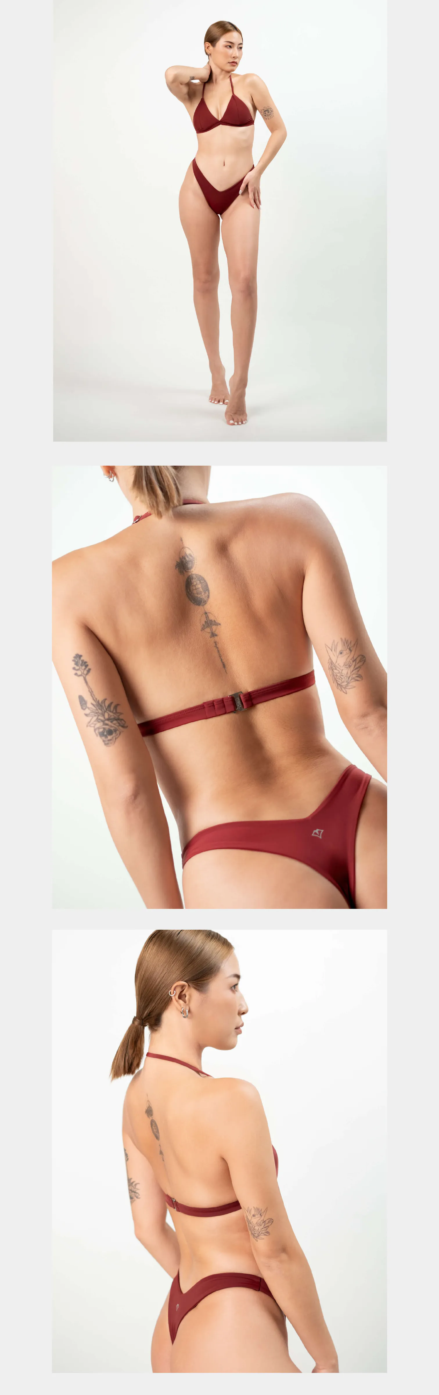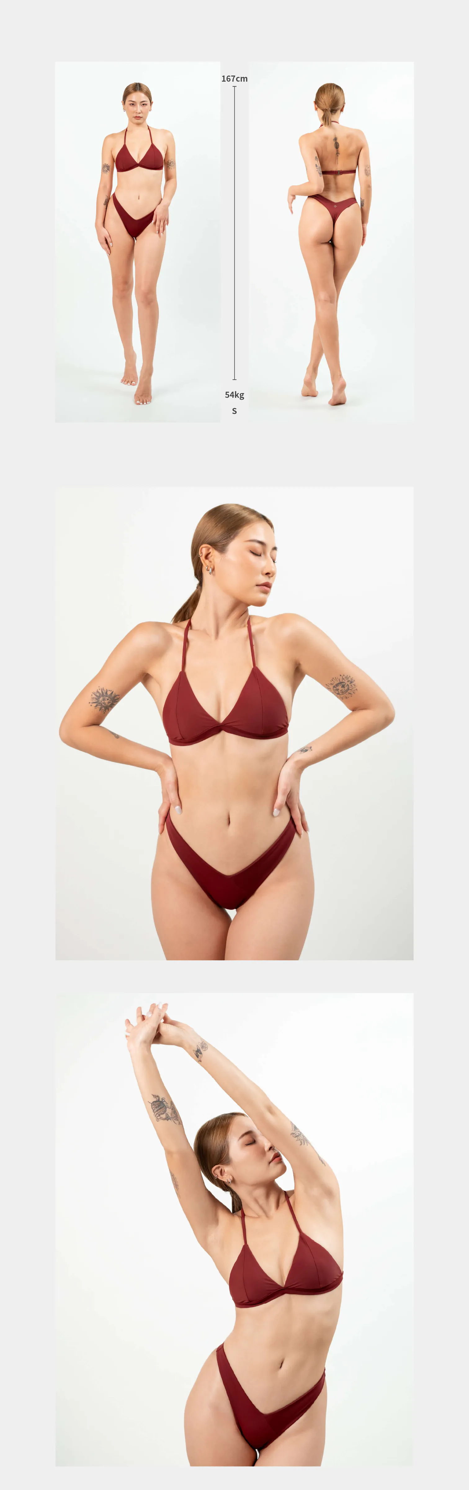 沉穩熱烈的性感,略帶黑色調的紅,給人一種內斂誘惑的氛圍;V 型拼接裁片細節讓斜邊更俐落高杈,極高衩設計修飾腰間肉肉,腿型更加修長。